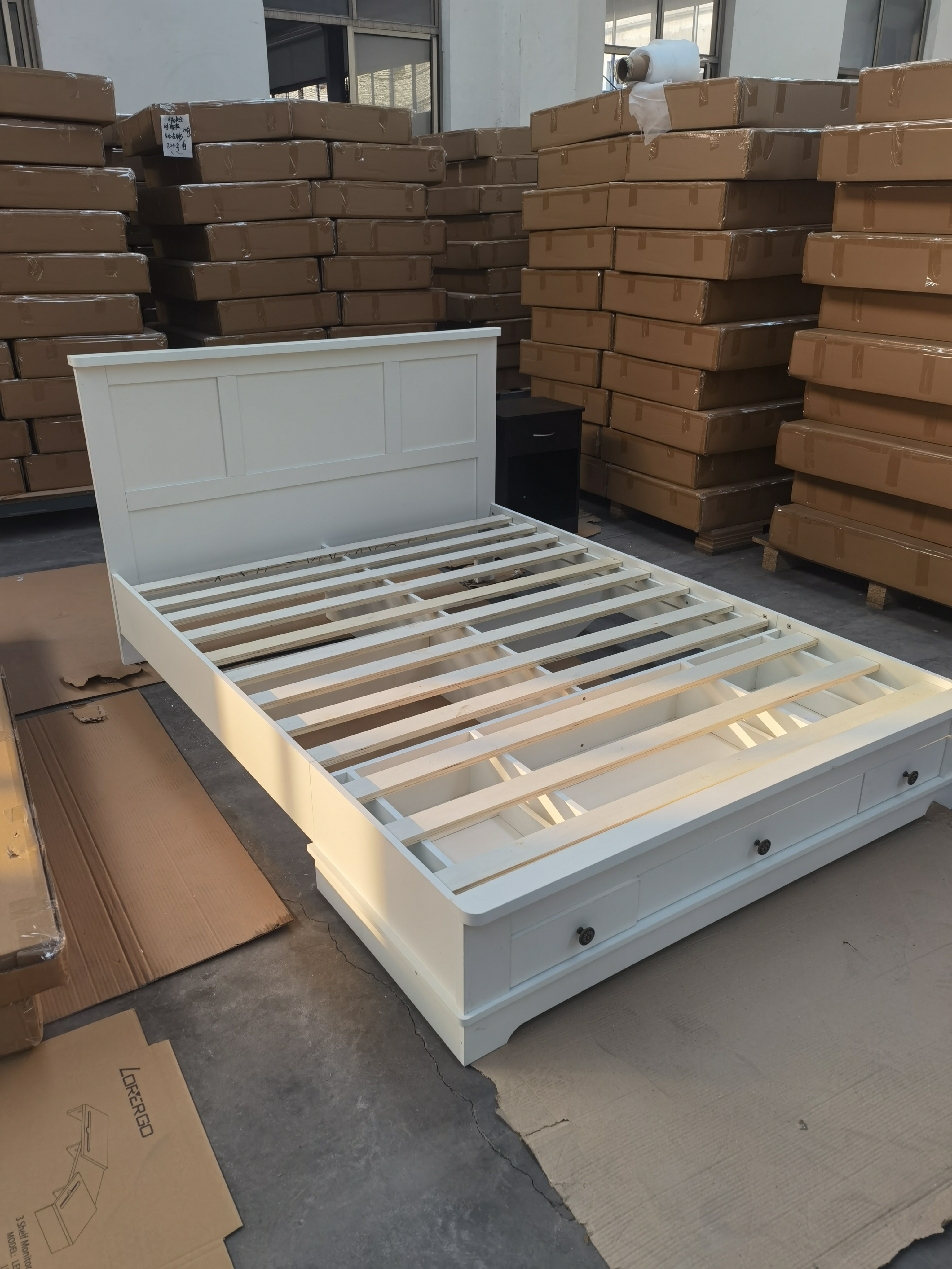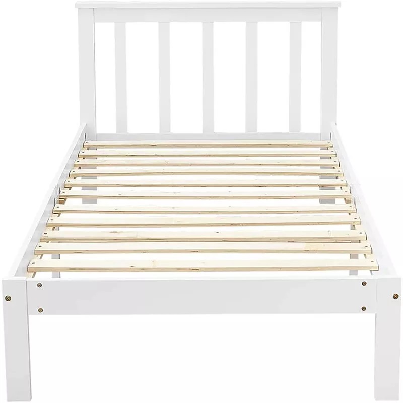Cama con plataforma de madera blanca con cabecero, pie de cama y soporte de listones de madera